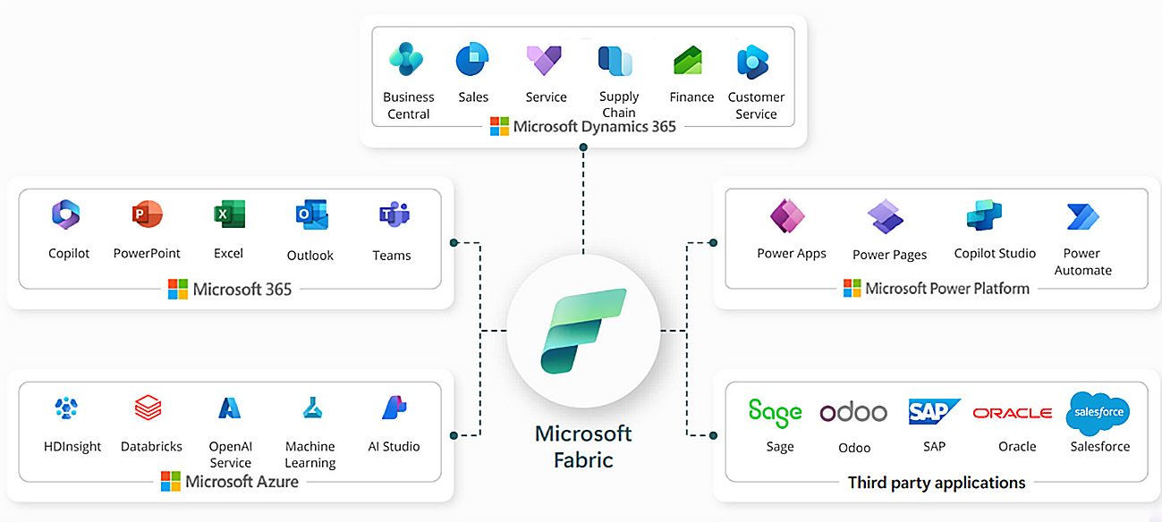 Una de sus principales fortalezas de Microsoft Fabric es su capacidad de integración: se conecta de forma nativa con otros productos del ecosistema Microsoft facilitando flujos de trabajo unificados y seguros. Además, Fabric también permite integrarse con soluciones de terceros, lo que amplía su versatilidad y permite adaptarse a entornos tecnológicos híbridos o personalizados.